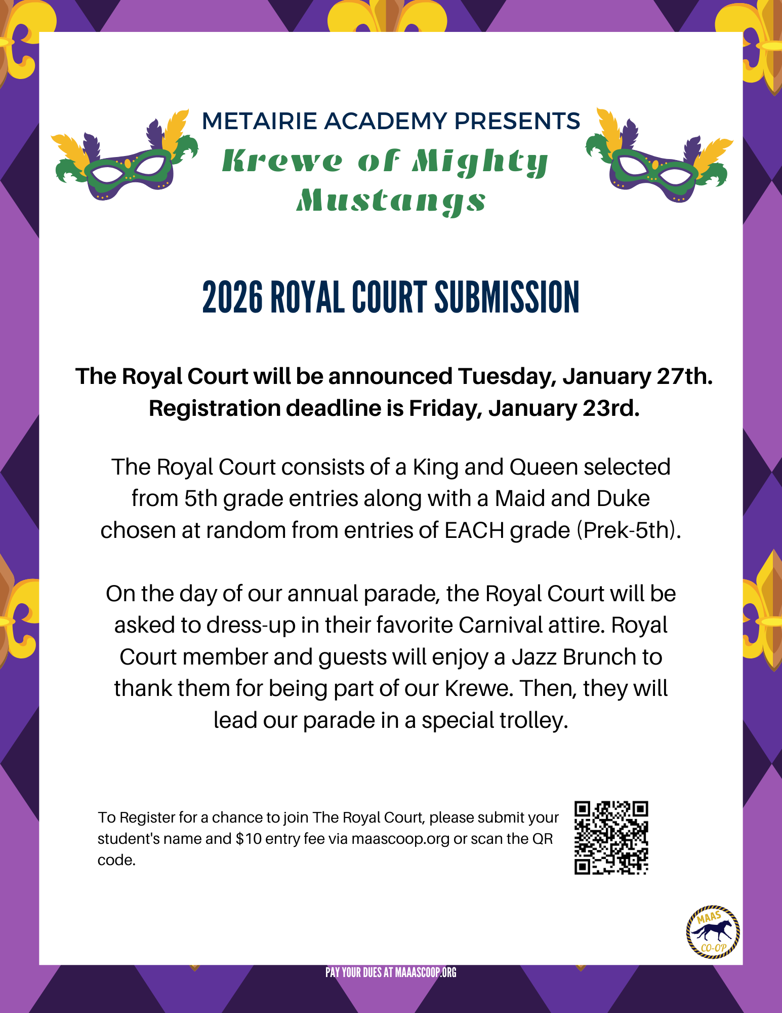 Mardi Gras Court Participation January 6, 2025January 25, 2026 Nicole Guilmino $10.00 Out of stock Category: Mardi Gras Description Description Enter for your chance to be a Maid or a Duke of your Grade! 5th Graders also have a chance to be Queen or King!